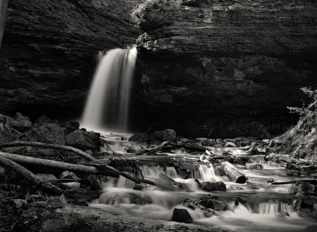 One particular spot isn’t far from my home. It’s only 11 miles away so it was one of the first places I discovered that I wanted to photograph. It is a waterfall tucked back into a bluff feeding into the Saint Croix River. I am a sucker for a good black and white waterfall photograph.