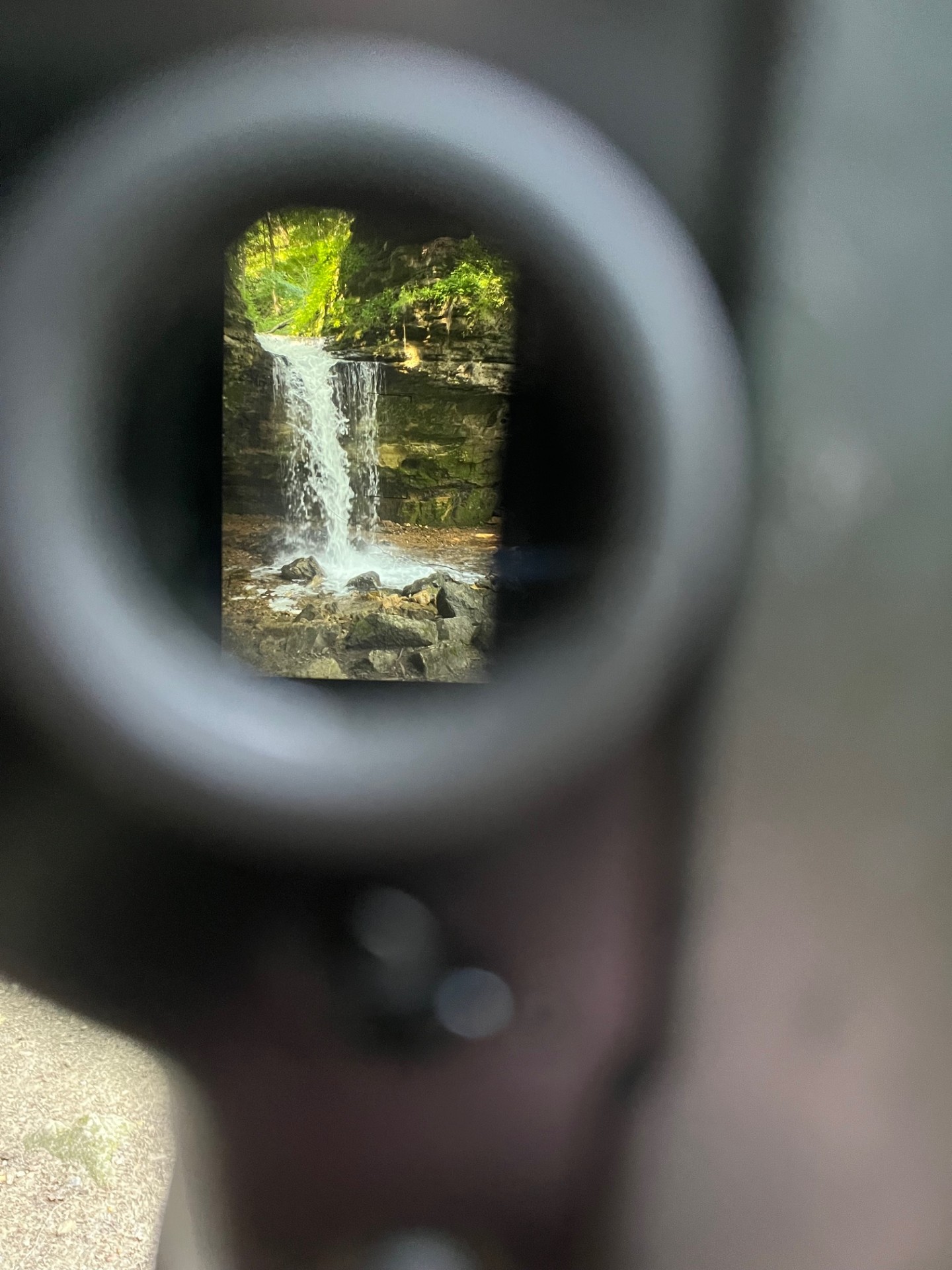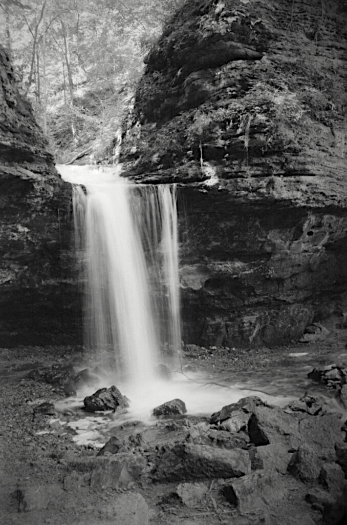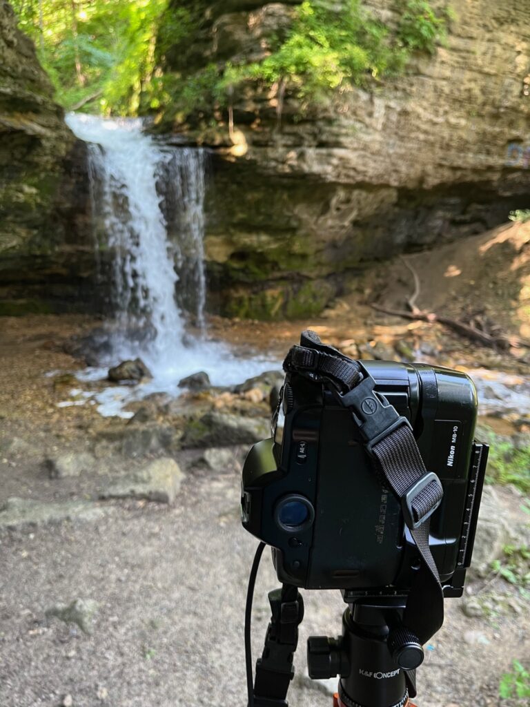 This is where the longer lens came into play. I made the trek back to the waterfalls a few days after my first success with the medium format, but this time I had my Nikon 35mm and a couple of longer lenses. I hefted my gear back up the rise just off to the left of the falls and set up.