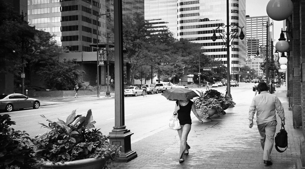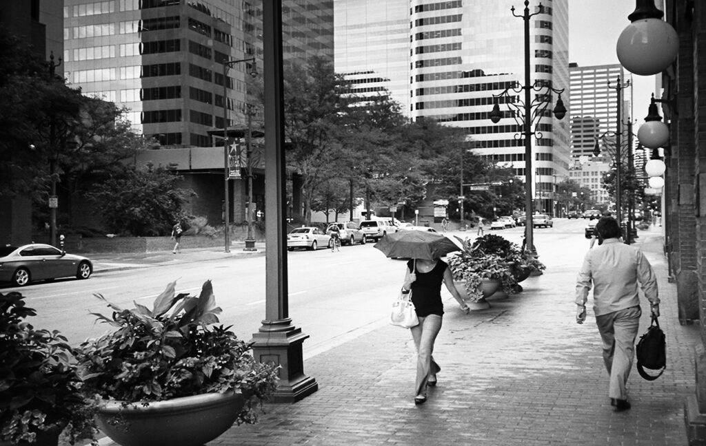 Rainy day on the streets of downtown Denver. Canon sure shot point and shoot with Kodak black and white film.